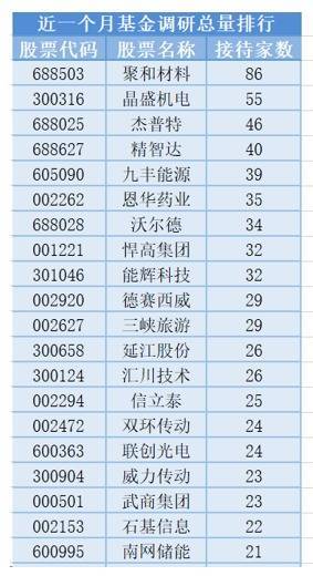 从个股调研情况上来看,最近1个月(9月10日-10月9日)最受公募基金关注的是聚和材料,属于光伏设备行业,主营业务为新型电子浆料研发、生产和销售。共有86家基金管理公司参与调研,其次是晶盛机电和杰普特,分别接受55家、46家基金管理公司的调研。