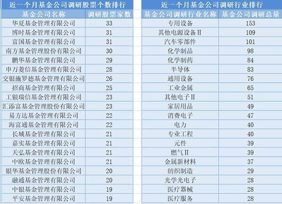 近一个月(9月10日-10月9日),华夏基金参与公司调研的数量最多,共调研33家上市公司,然后调研较为活跃的还有博时基金、富国基金和南方基金,分别调研31家、31家、30家上市公司;从调研行业上来看,基金公司对专用设备行业的上市公司调研次数最多,共有153次,其次是其他电源设备II行业,基金公司调研了109次。